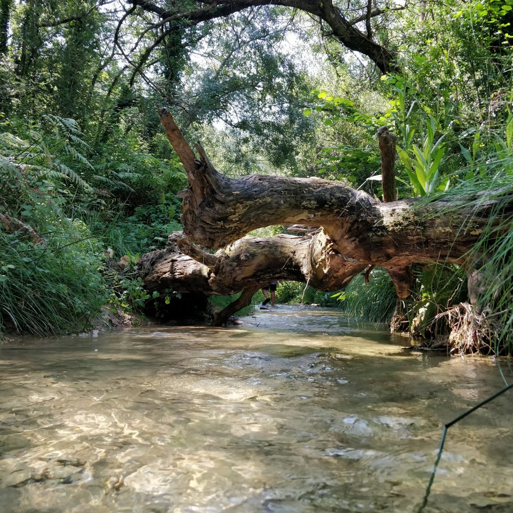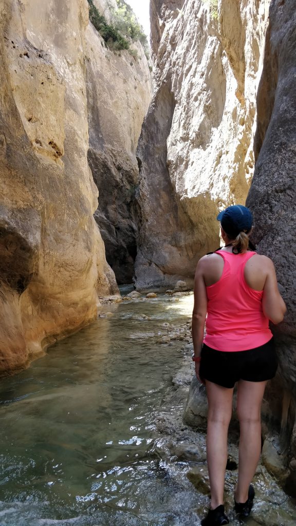 ¡Allí empieza la verdadera aventura! Entramos en un riachuelo con poco menos de un palmo de agua … Poco a poco y río a bajo éste se va ensanchando. La ruta se hace con facilidad y muy agradable al poderse remojar.